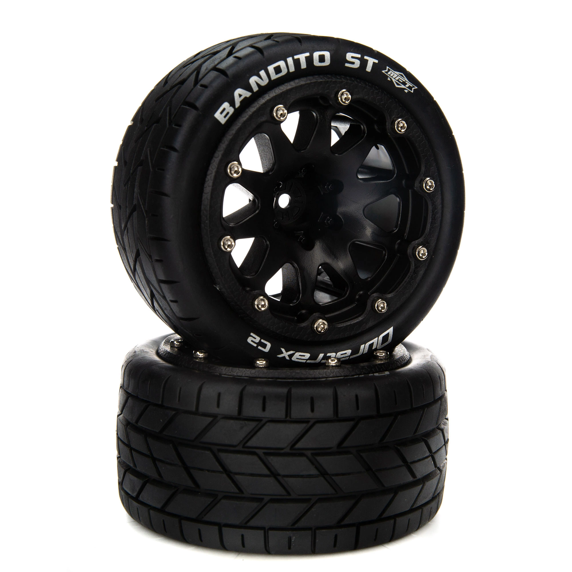Factory-mounted, these Duratrax® BANDITO™ ST front/rear tires for the 1/10 scale ARRMA® GRANITE™ 4X4 BLX Monster Truck feature a tread pattern that’s perfect for running on pavement, hard-packed clay, and similar conditions. Molded from a durable black composite plastic, the 14mm hex wheels measure 2.8 inches (56.3mm) wide and 4.7 inches (119.1mm) in diameter. The belted tires include one-piece foam inserts and white sidewall markings, and are made from high-traction C2 soft compound. Sold in pairs.