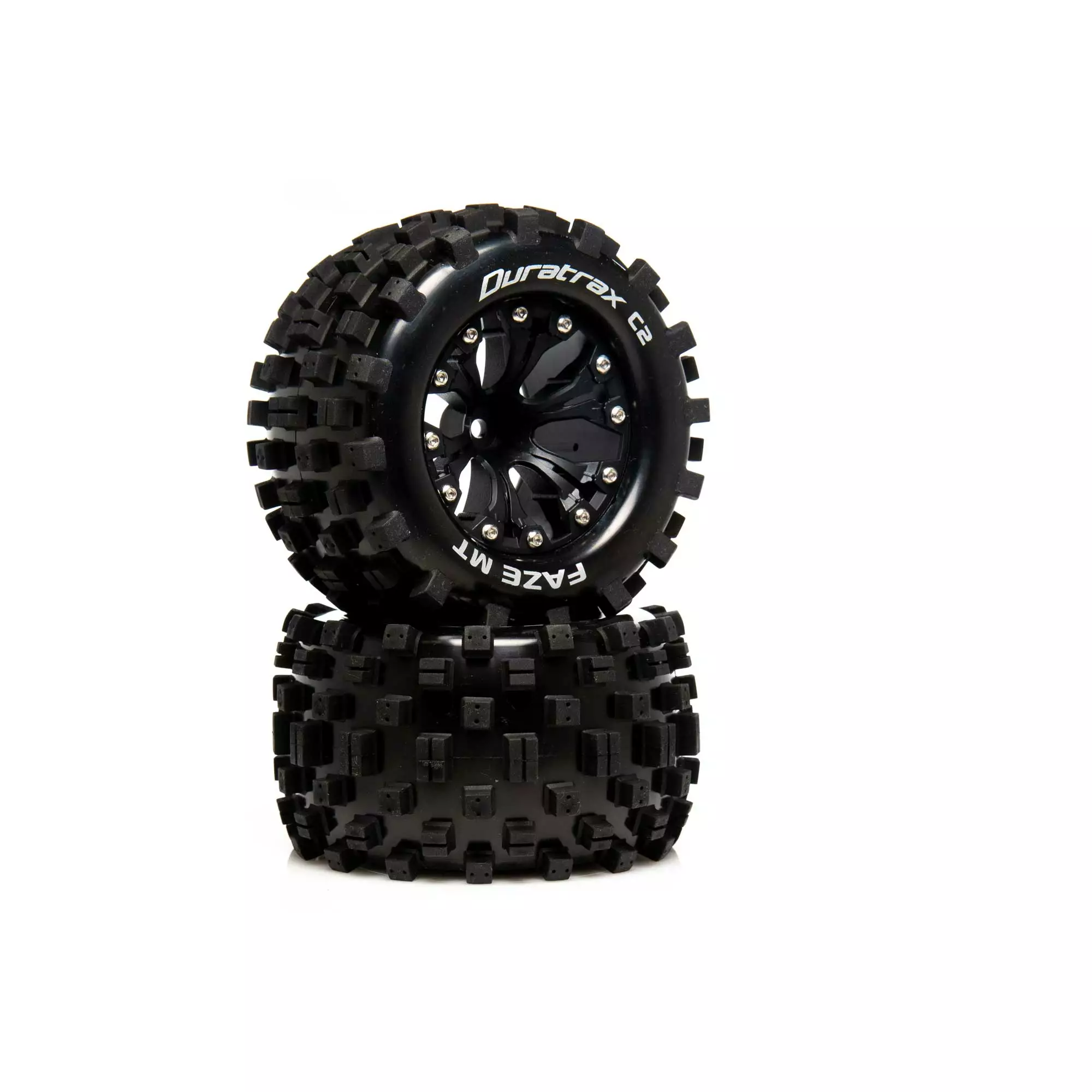 Factory-mounted with a .5 offset, these Duratrax® FAZE™ MT rear tires for 1/10 scale 2WD monster trucks feature a tread pattern that’s ideal for a wide variety of surfaces — pavement, hard-packed dry and wet tracks, grass, mud, and loose, dry and loamy surfaces. The wheels are molded from a durable black composite plastic with a 12mm hex and 2.7 inch (69.4mm) width. The tires are made from high-traction, C2 soft compound and are 4.9 inches (123.6mm) in diameter. Sold in pairs.