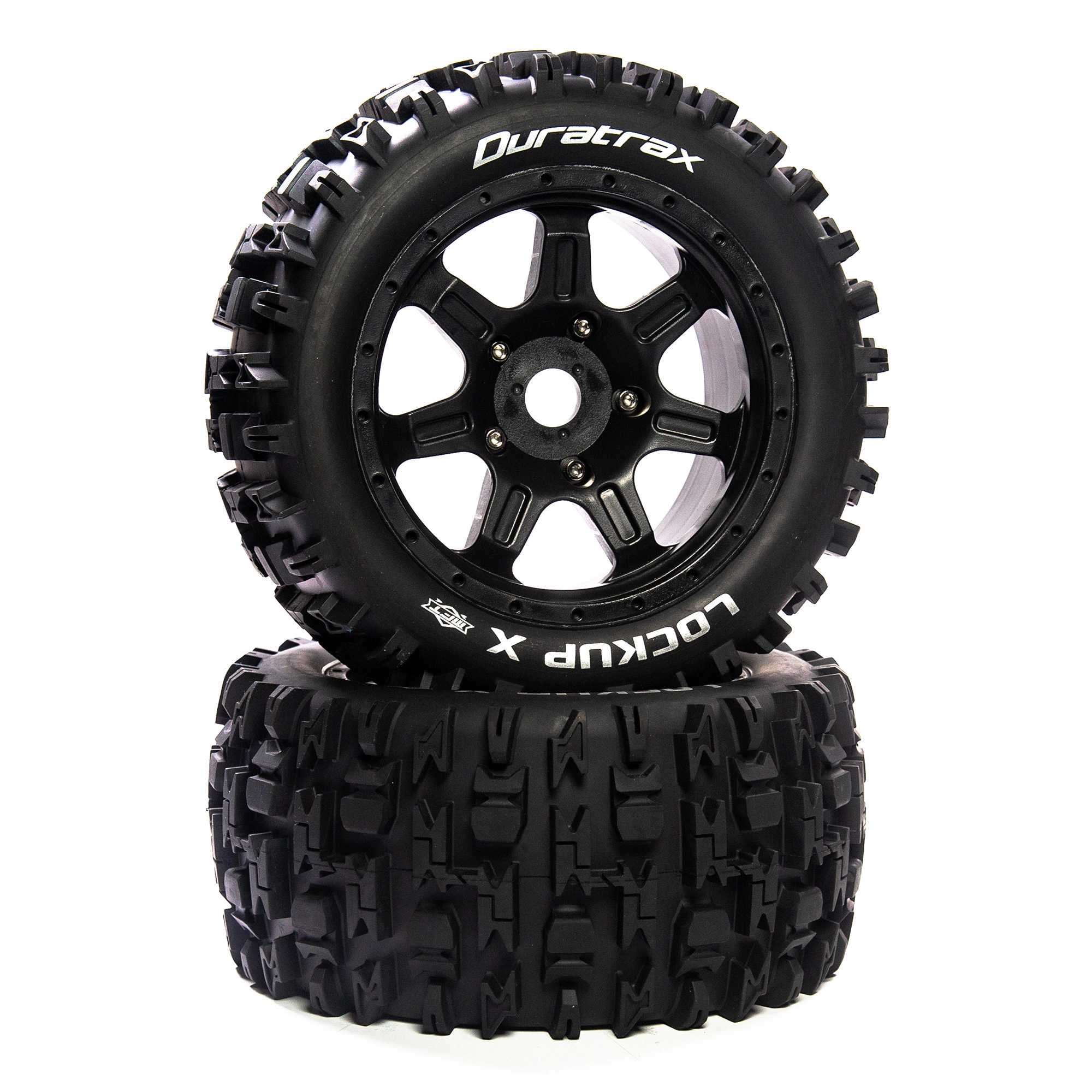 For running on a variety of surfaces Duratrax offers these factory mounted 1/5 scale LOCKUP X MT front/rear tires for the ARRMA KRATON 8S monster truck and ARRMA OUTCAST 8S stunt truck. They feature a tread pattern that’s perfect for a wide range of surfaces: pavement, hard-packed wet or dry, loose-dry loamy, loose-wet mud and grass. Molded from a durable black composite plastic, the 24mm hex wheels measure 3.9 inches (98.2mm) wide and 8.4 inches (212.8mm) in diameter. The belted tires include one-piece foam inserts and are made from medium firm CS Sport compound. Sold in pairs.